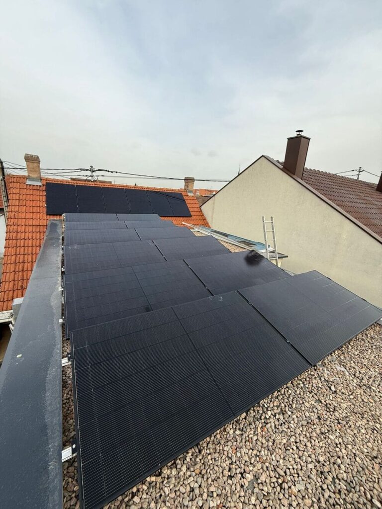 À Holtzheim, nous avons installé des panneaux solaires chez un particulier qui voulait en même temps consommer sa propre électricité et stocker de l’énergie. Notre équipe a installé une centrale de 6 kWc sur un toit plat. Pour la pose, nous avons utilisé des structures Renusol lestées, ce qui assure la stabilité sans abîmer l’étanchéité du toit. Nous avons choisi une orientation Est pour produire le plus possible dès le matin. Avec des panneaux DMEGC, un onduleur HUAWEI et une batterie HUAWEI de 5 kWh, le client peut produire et stocker son électricité. L’électricité en plus est utilisée le soir ou la nuit, ce qui diminue beaucoup sa dépendance au réseau EDF et améliore son autonomie.